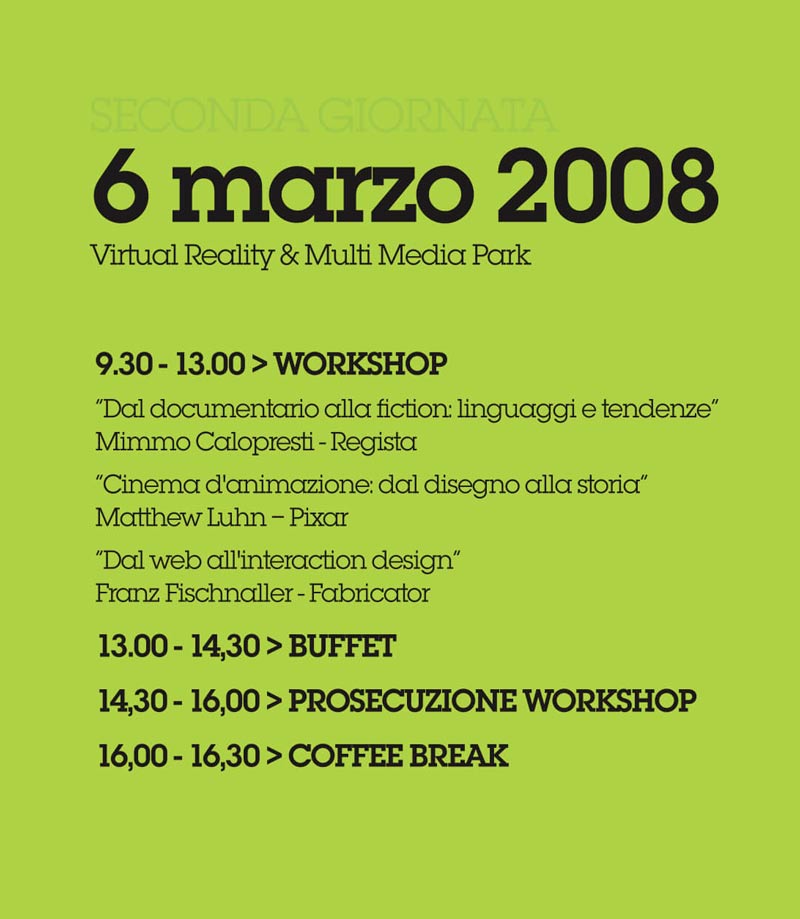 12 Novembre 2007 al 21 Gennaio 2008, ha visto la partecipazione di circa 80 autori per le tre categorie in gara: audiovisivi, animazione e siti web. | 30 autori finalisti (dieci per categoria, scelti dalla giuria di esperti indicati dai partner dell’iniziativa) hanno partecipato come premio al Fabermeeting, la tre giorni di incontri, dibattiti e workshop con aziende della “creative